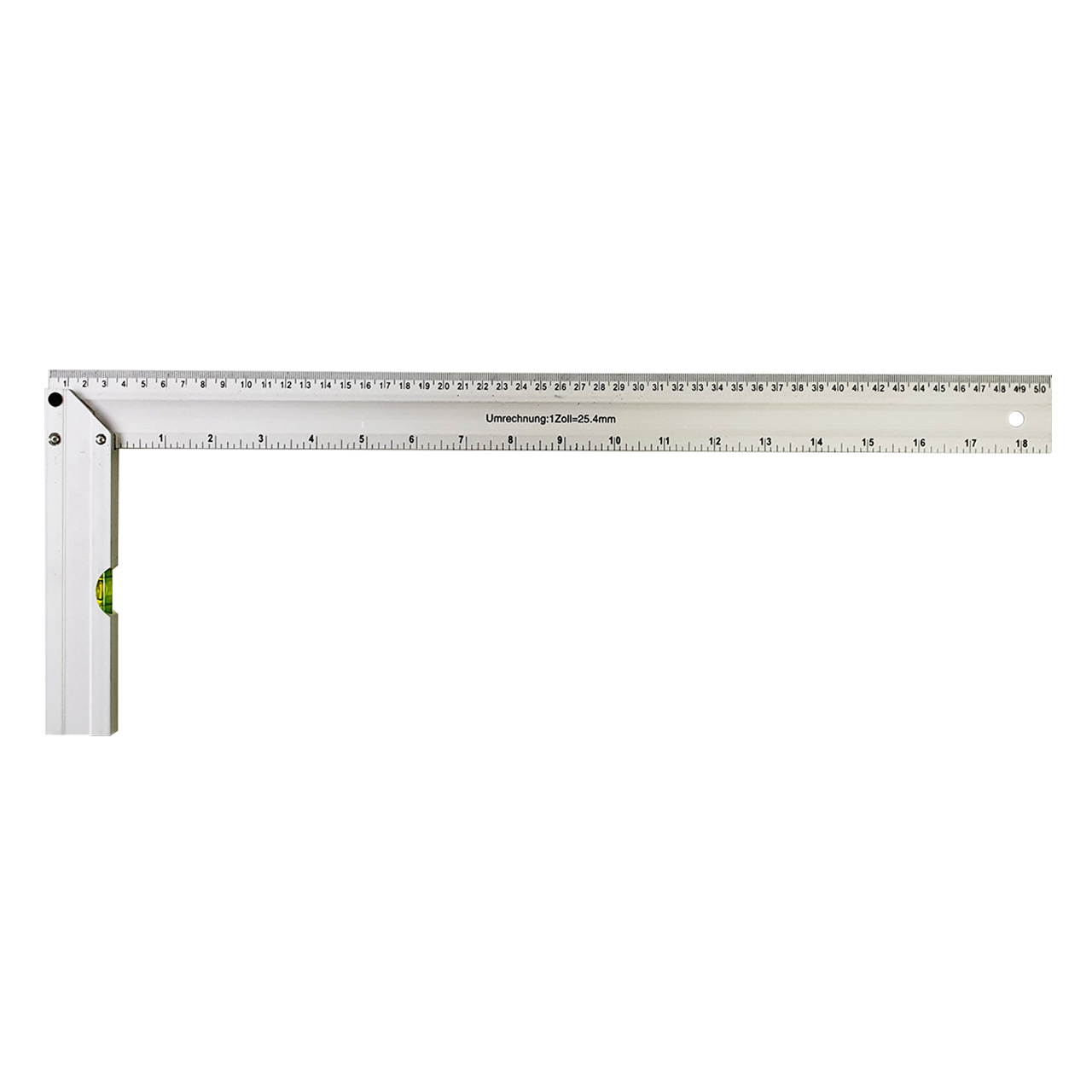 Полотно угольника 500 мм надежно прикреплено к удобной алюминиевой ручке и оснащено специальным отверстием для хранения инструмента в подвесном состоянии.