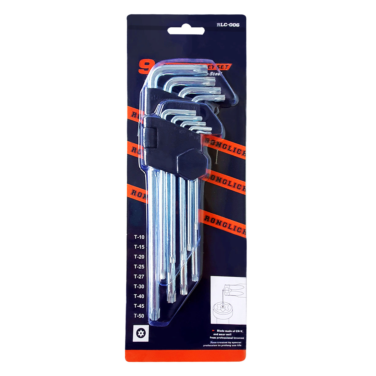 Набор ключей звездочек содержит 9 специализированных инструментов 1.5-10 мм диаметром Г-образной формы с двусторонним исполнением. Ключ Torx имеет шлиц в форме шестилучевой звезды.