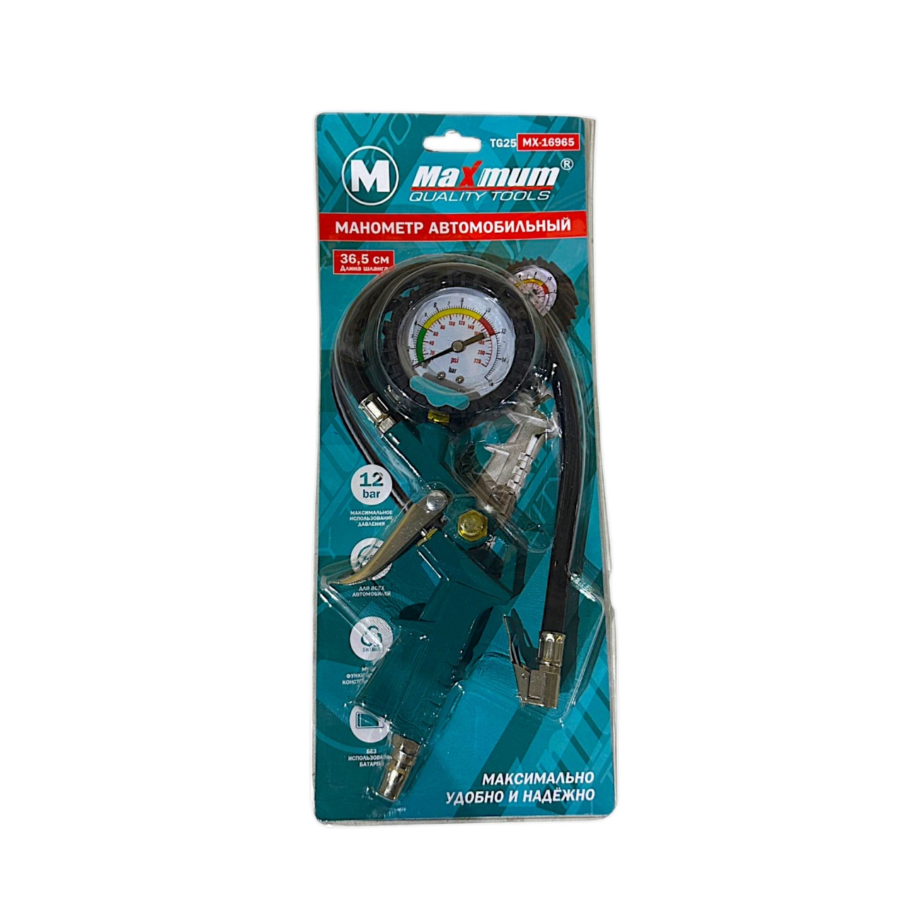 Пистолет с манометром предназначен для измерения давления и подкачки шин. Пневматический пистолет оснащен кнопкой стравливания воздуха и манометром с двойной шкалой, что дает возможность контролировать давление в шинах во время подкачки. Гибкий шланг 36,5 см позволяет производить работы в узких и труднодоступных местах. Легкий алюминиевый корпус прорезинен. Шланг 15 атмосфер и соединение типа рапид созданы для быстрого и удобного подключения.